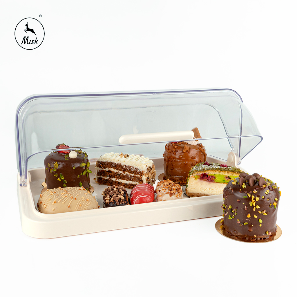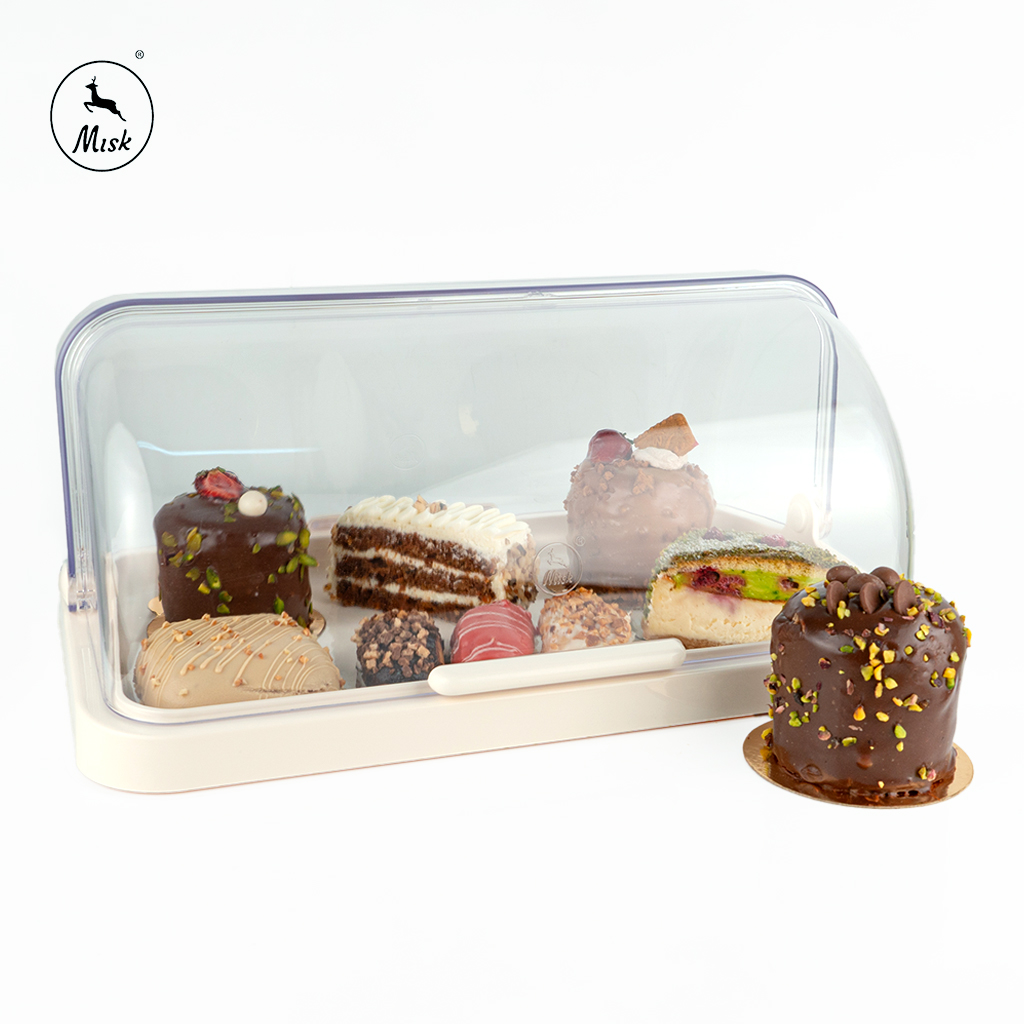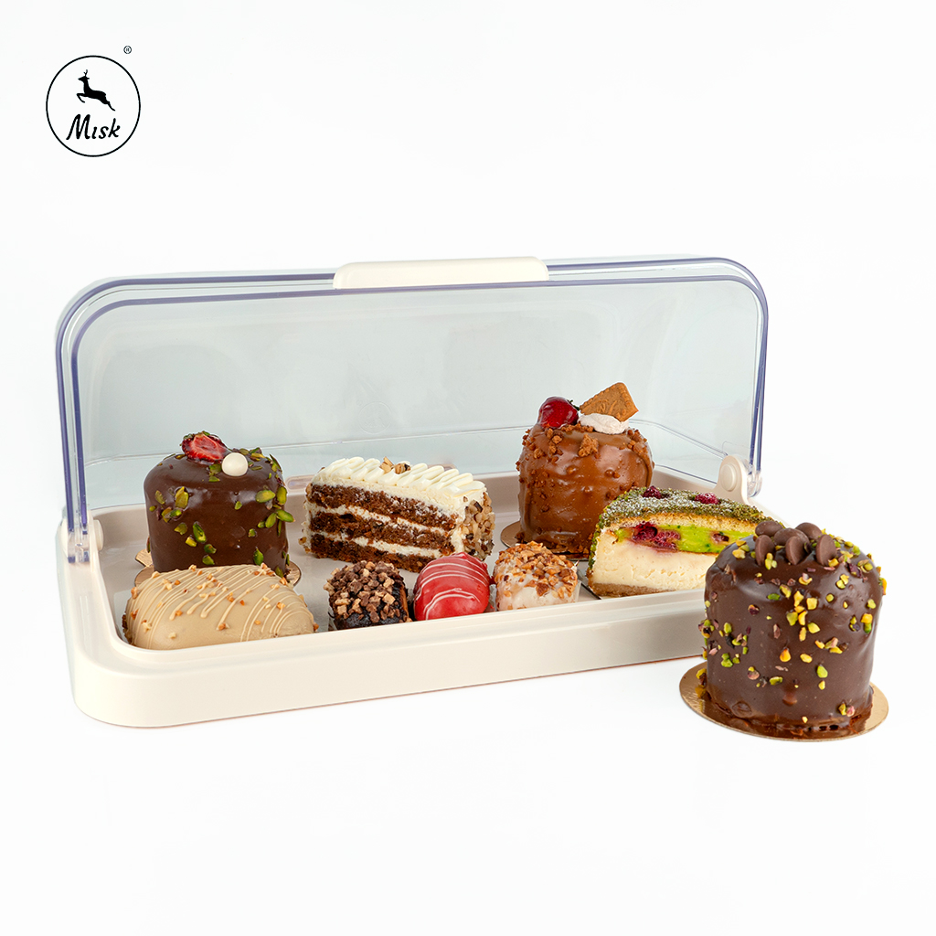 أضف لمسة فاخرة لتقديم وحفظ الحلويات مع صندوق أنيق بغطاء شفاف بالكامل يتيح عرض المحتويات بشكل مغرٍ. تصميمه المسطح والواسع يناسب أنواع الكيك، التارت، والقطع الصغيرة من الحلويات، مع قاعدة متينة تحافظ على ثبات القطع أثناء النقل أو العرض. مصنوع من مواد آمنة للطعام وسهلة الغسل، ويجمع بين الحماية والجاذبية في نفس الوقت، ليكون مثاليًا للمناسبات أو حتى التخزين المنزلي.